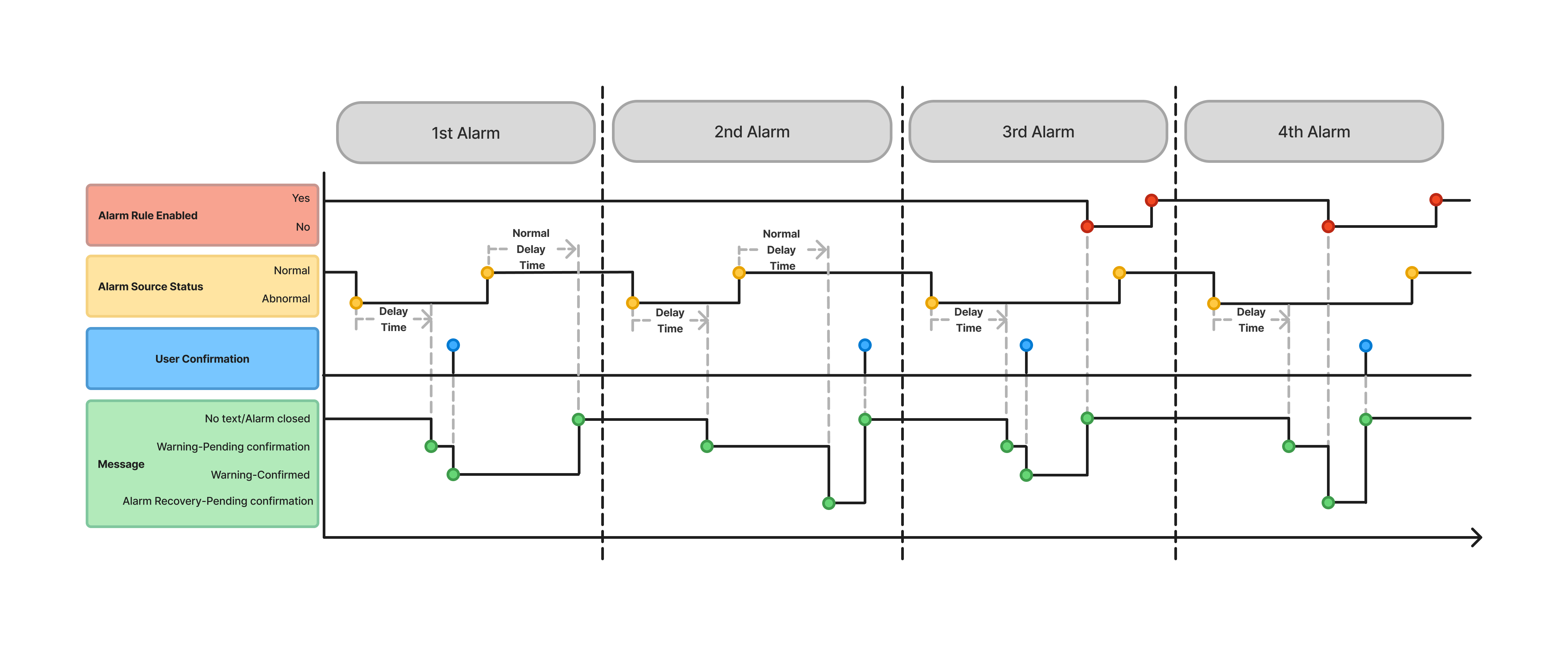 - Warning-Confirmed: The alarm still exists, but the user is aware of it, indicating that the alarm is being dealt with.