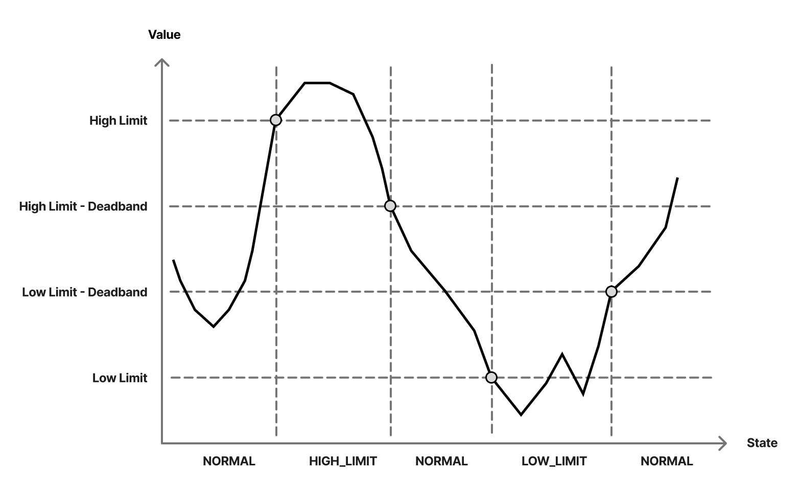 The diagram below shows how the alarm state responds as the device reading crosses the low and high limits, as well as when it returns to the recovery points (low limit + deadban, and high limit - deadband).