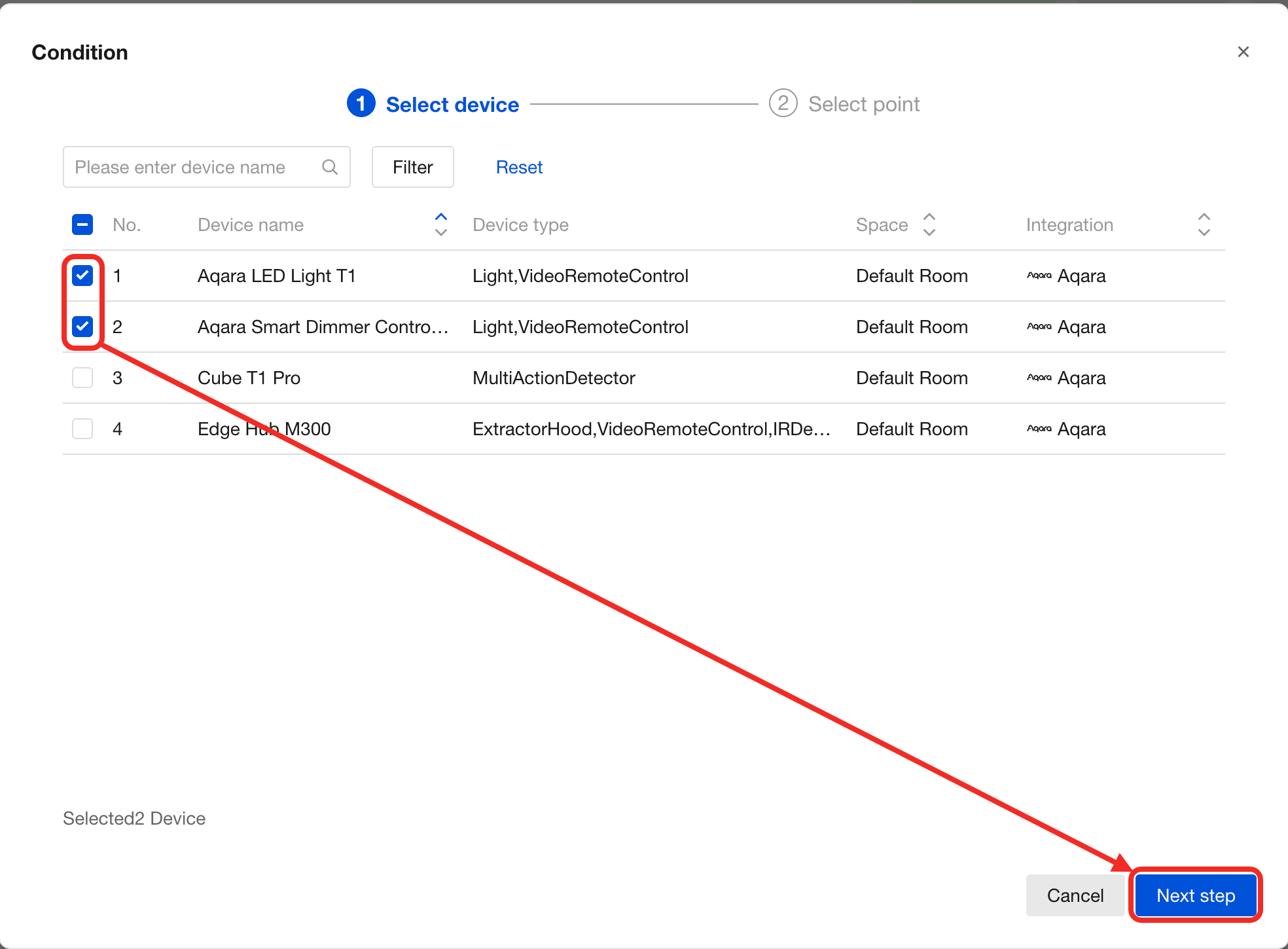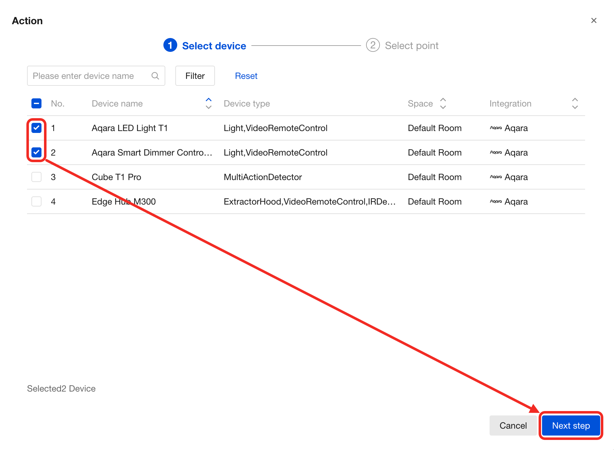 After selecting this block, the system will pop up a device selection window where you can check the target device and target action in the list, then add the corresponding action block anywhere on the canvas.