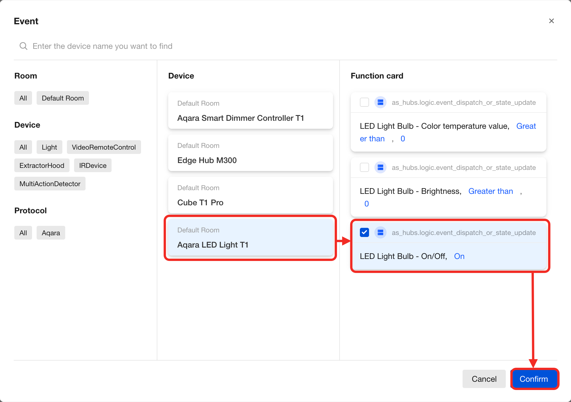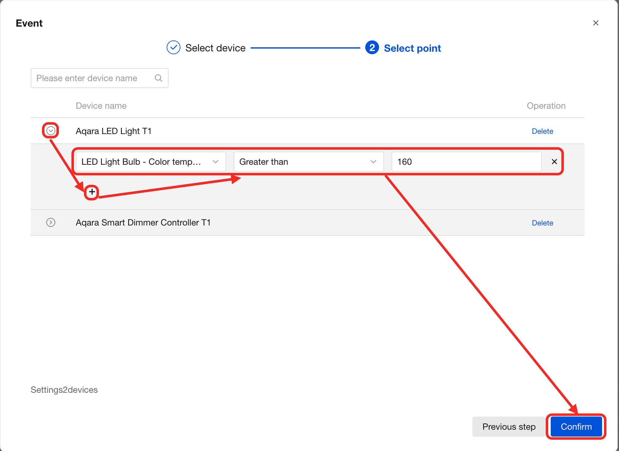 Expand the devices, click the + button to add the events or states you need to monitor. After adding, click Confirm.