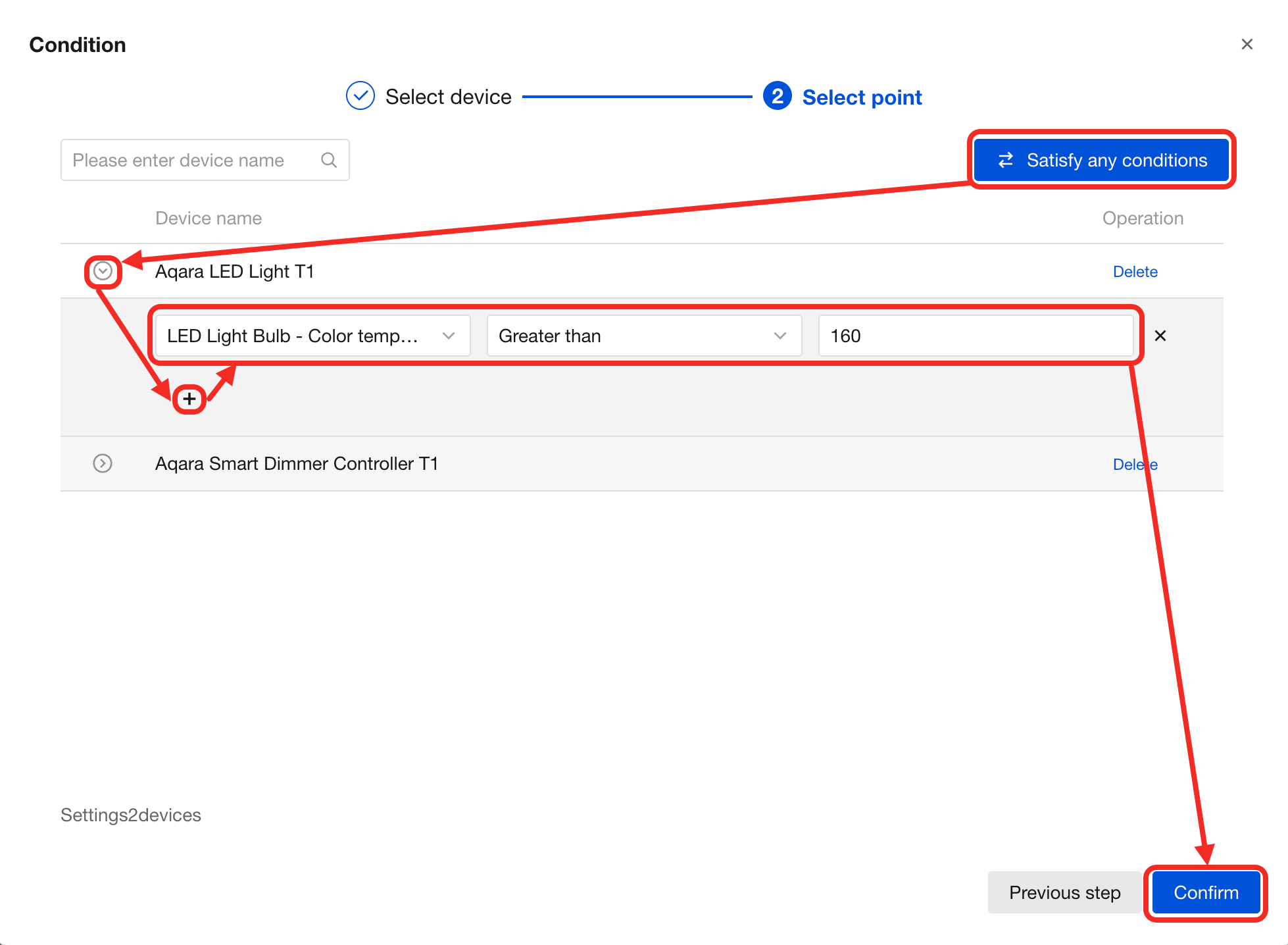 Choose "Satisfy any conditions" or "Satisfy all conditions", expand the devices, and click the "+" button to add the states you need to check. After adding, click "Confirm".
