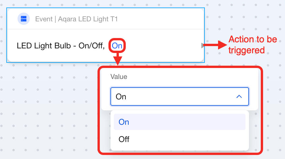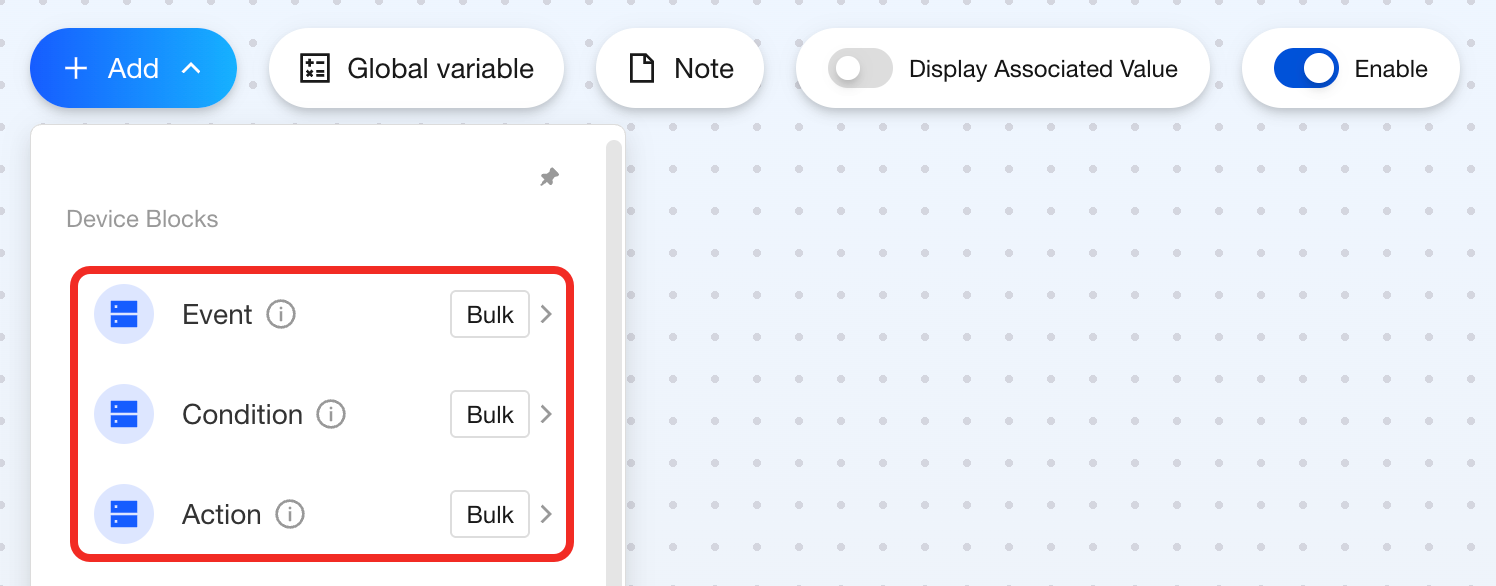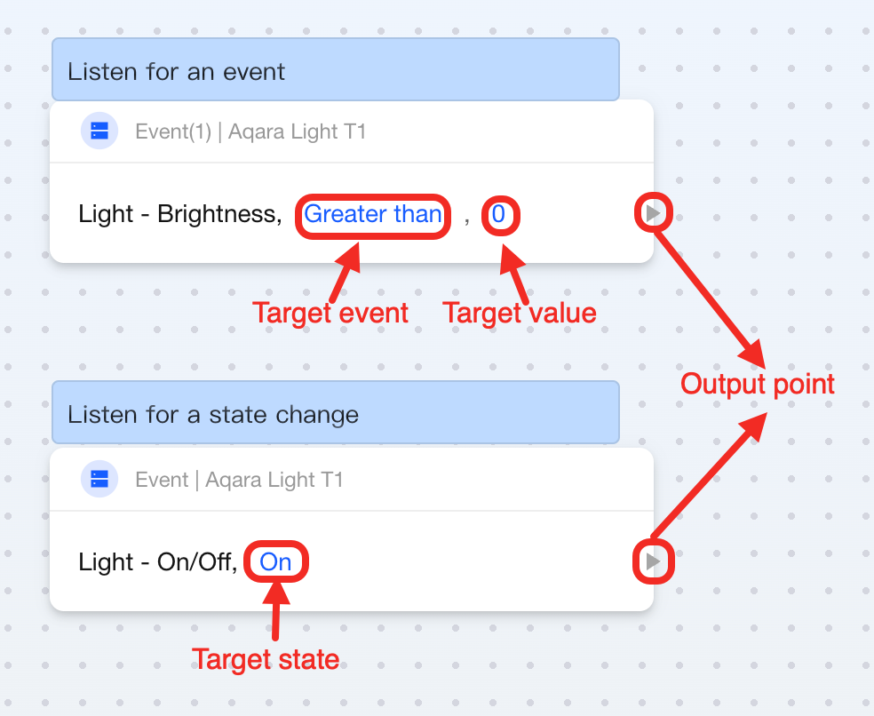 You can use this block to trigger subsequent operations when a device experiences an event (such as a button press or voice command reception) or enters a state (such as environmental data changes or door/window opening).