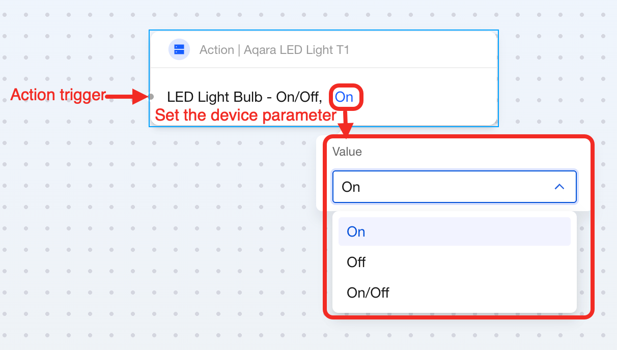 | Device Parameters | ✔ | Set the device parameters you want to modify, such as switch state, cooling temperature, color temperature, etc. |