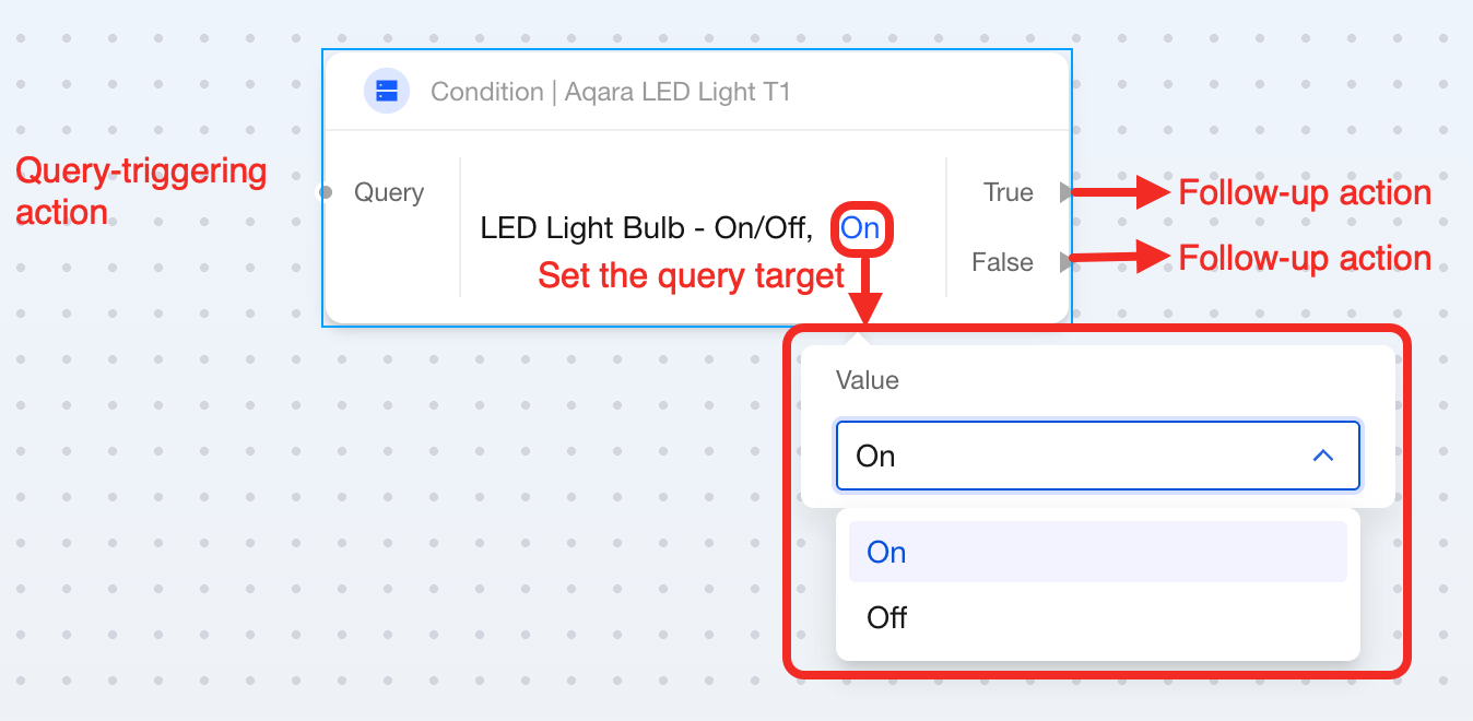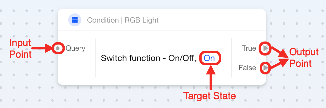 | True (Output Point) / False (Output Point) | At least one of the two is connected | True: it connects to steps to be executed when device state matches the target state; False: it connects to steps to be executed when device state does not match the target state. |
