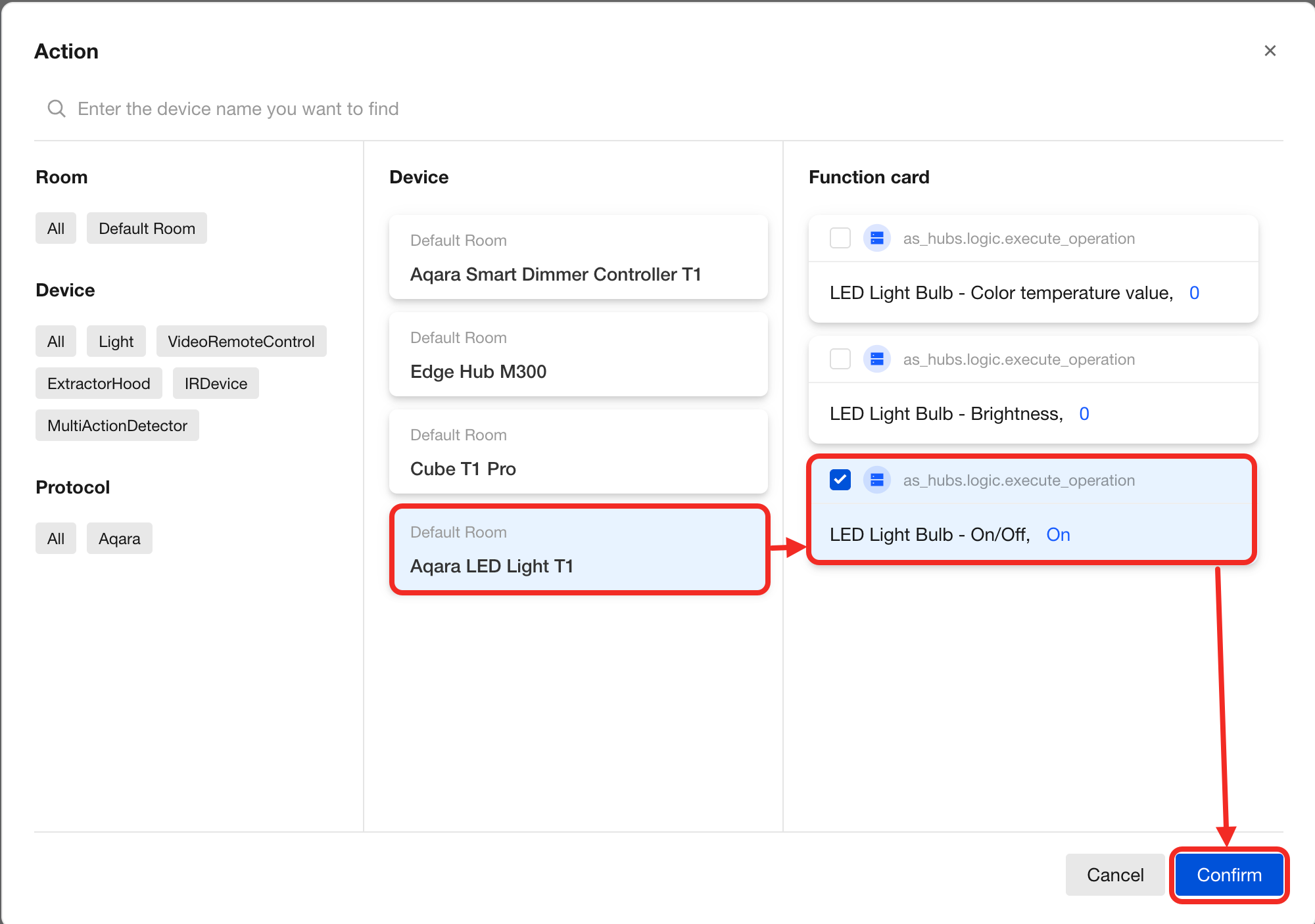 Expand the devices, click the "+" button to add the actions you need to execute. After adding, click "Confirm".