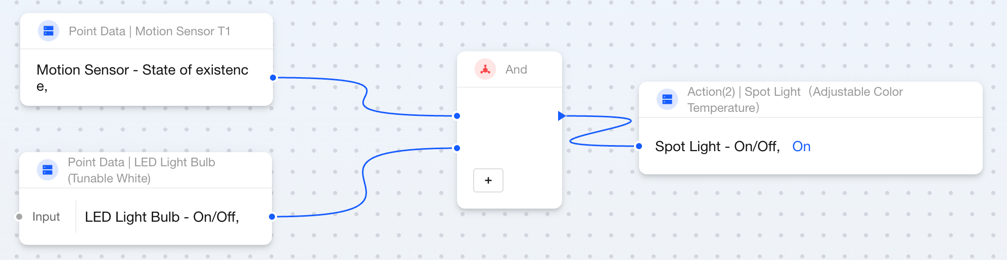 The AND block usage steps described in this section do not include time restrictions. If you need to add validity periods for state changes, please refer to the timer blocks State Duration - Control Devices Based on Logical Operation Results.