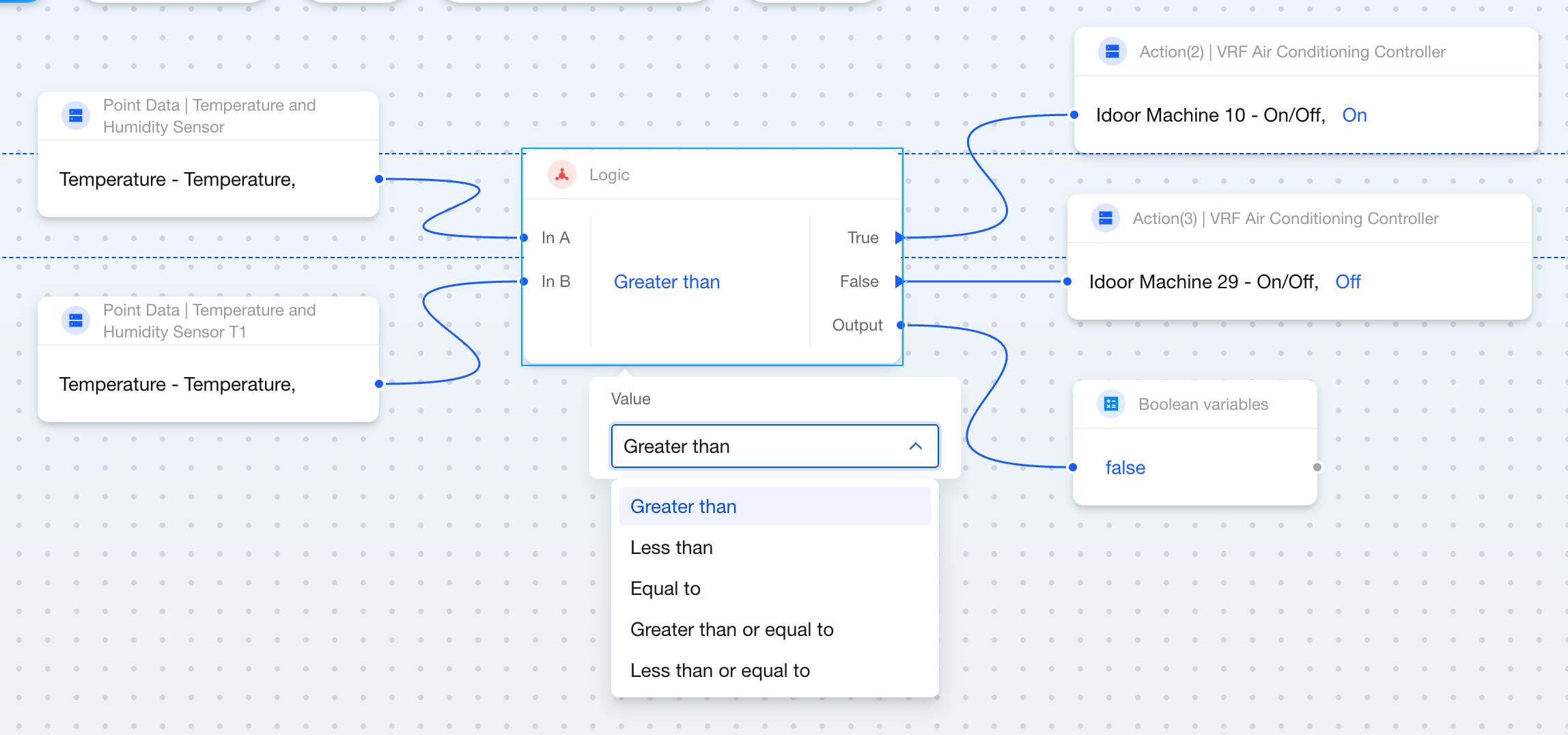 - Connect a Boolean Variable block to the right side of the block to get the comparison result. This point can also connect to other blocks, such as AND and OR blocks.