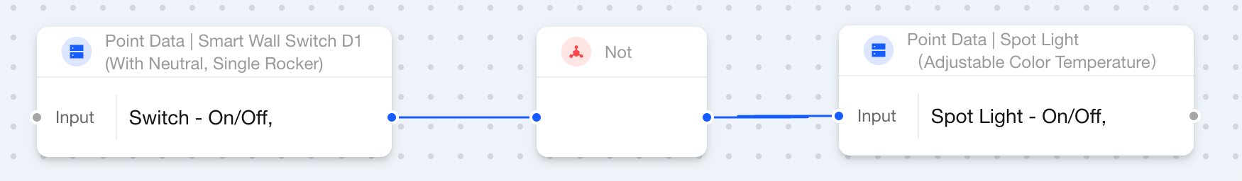 | Output Point | ✔ | It connects a boolean Point Data to receive the opposite boolean value of the input data. |