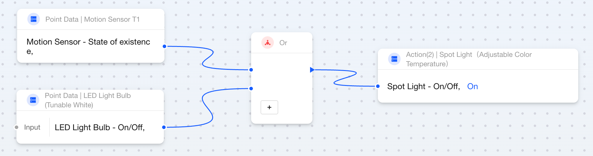 The OR block usage steps described in this section do not include time restrictions. If you need to add validity periods for state changes, please refer to the timer blocks State Duration - Control Devices Based on Logical Operation Results.