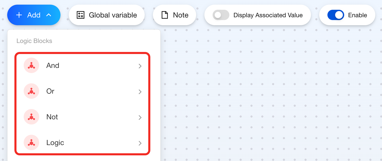 In automation scenario configuration, if you want to determine whether to execute a step based on the combination results of multiple conditions, you need to use logic blocks, including: AND, OR, NOT, and Logical Operations.