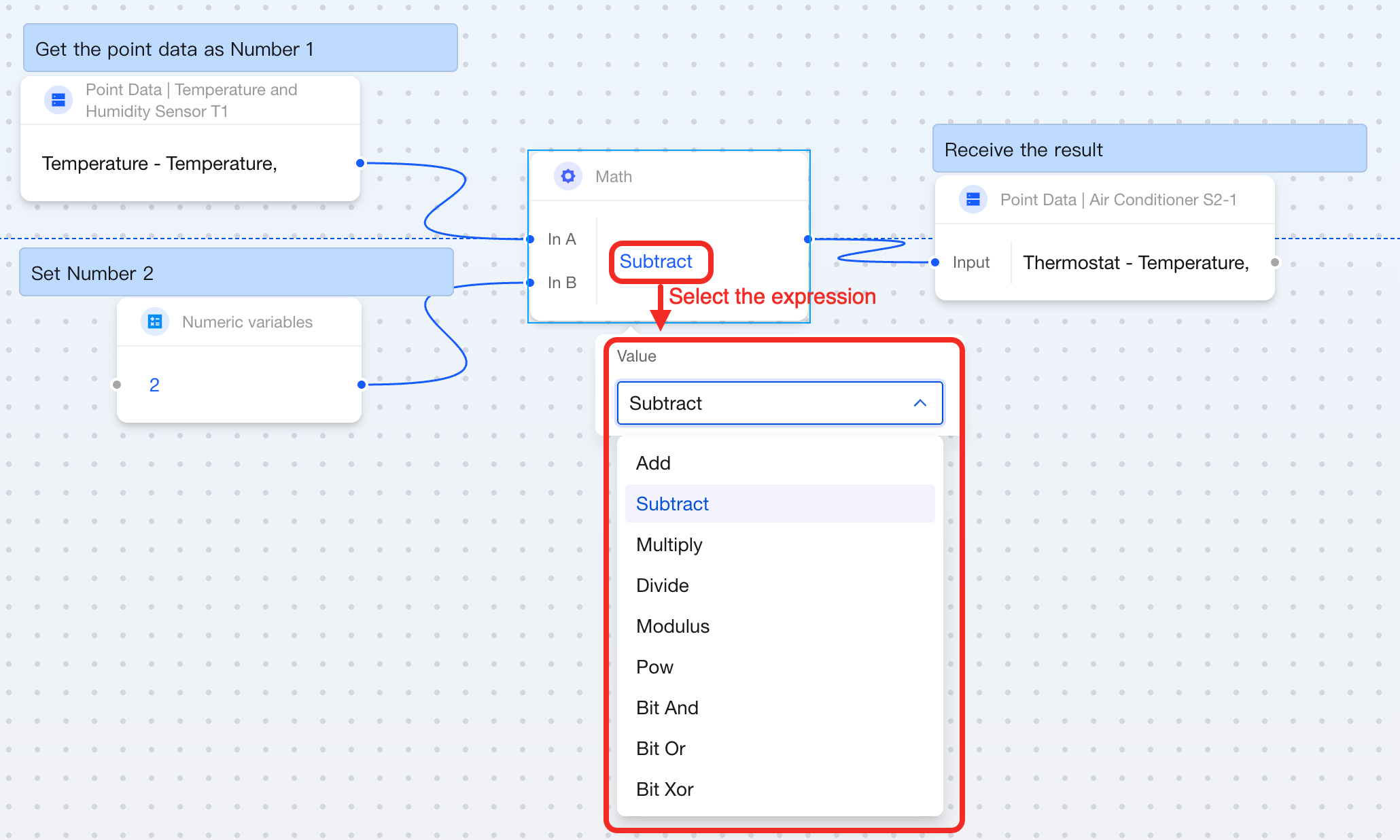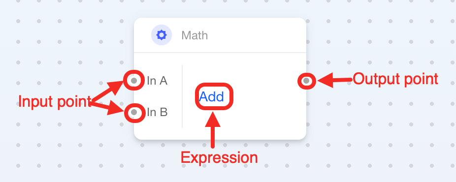| Output Point | ✔ | Connect to 1 numeric variable block to record calculation result, or to other blocks that receive number. |