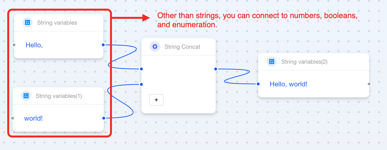 - Connect the variable blocks you want to concatenate (supports string, numeric, boolean, etc.) to the input points on the left side of the block.