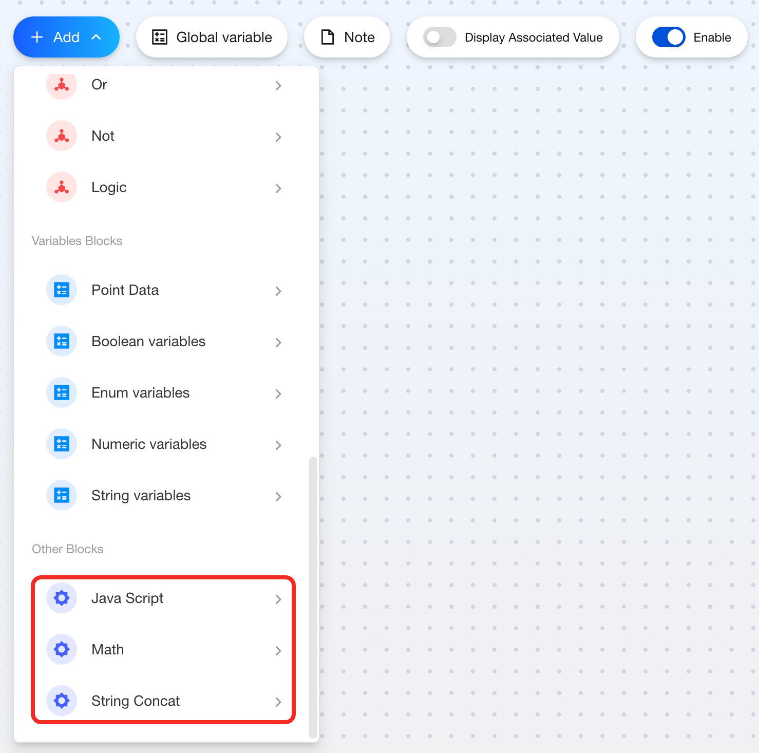 This category includes JavaScript, Math, and String Concat. These blocks support advanced scenarios like custom conditions, dynamic value calculations, and formatted text generation. They help you achieve greater precision and customization in automation. With these blocks, you can move beyond basic logic and design more powerful workflows.