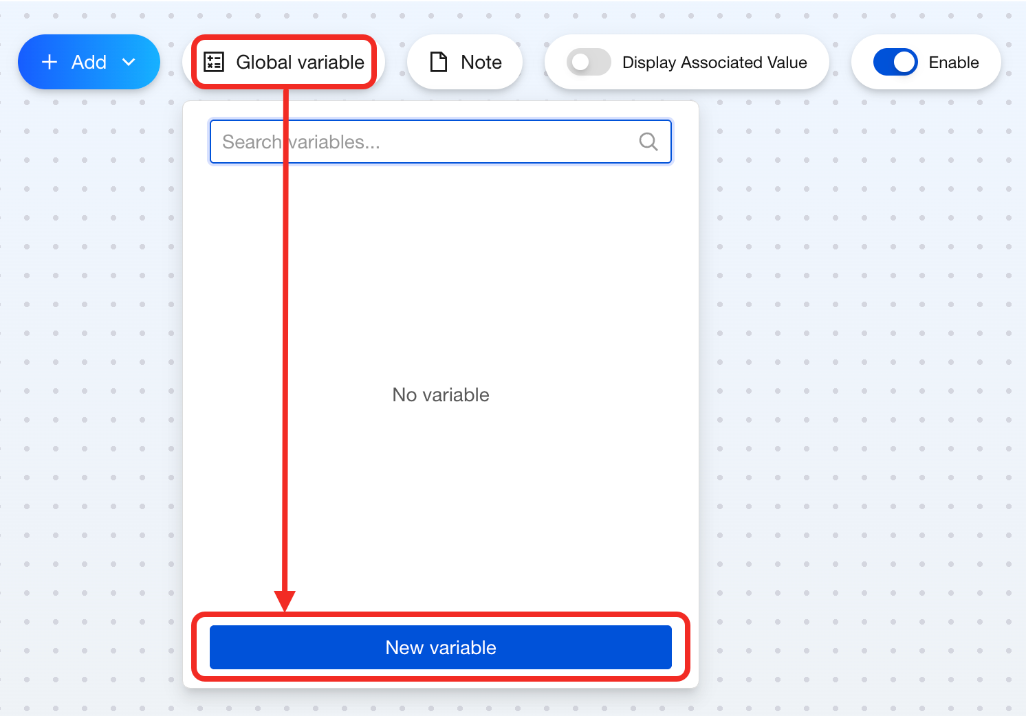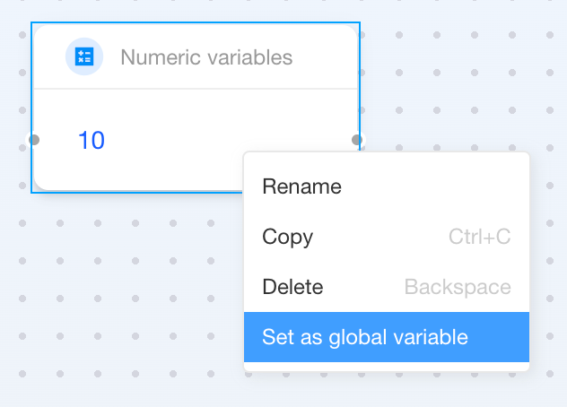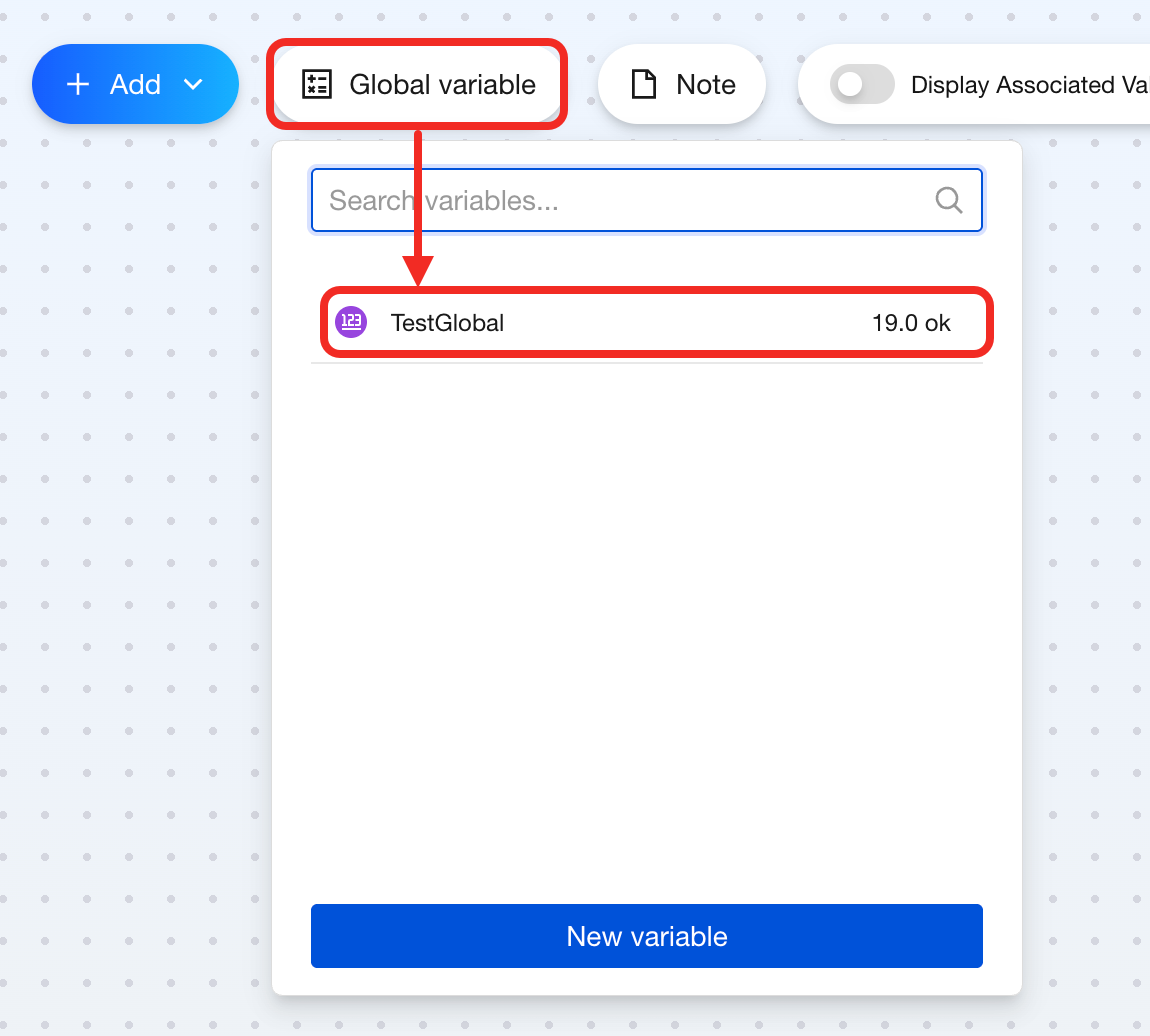 After confirming, place the variable block anywhere on the canvas. It serves as the definition of the global variable and can be referenced by other flows.