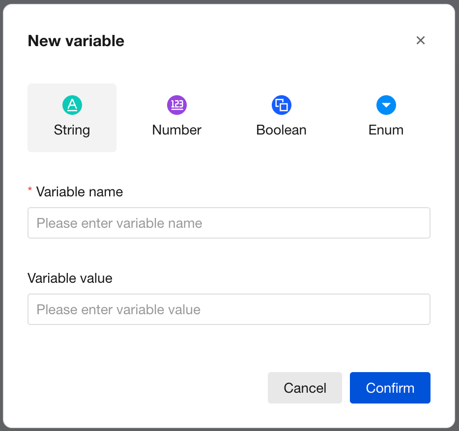 In the dialog, set the variable type, name, and value. Then click Confirm.