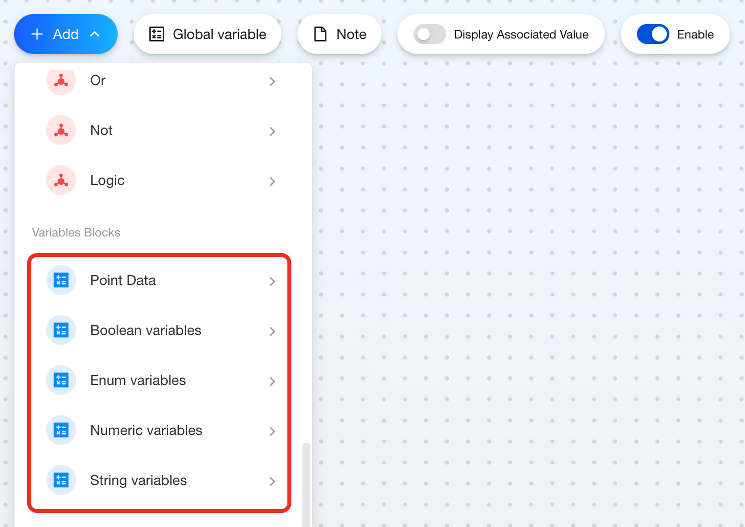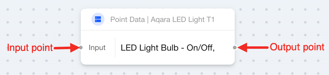 | Output Point | ✘ | It outputs real-time data. It Can connect to other Point Data blocks, Math, Logic, String Concat, or JavaScript blocks. |