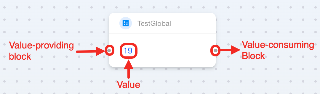 Click anywhere on the canvas to create the global variable block. This is a dual-point block. It can receive new values or output its current value. Depending on the variable type, connect it to other blocks as described in the relevant sections above.