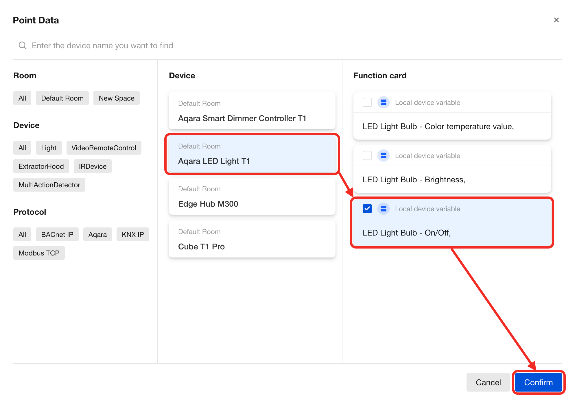In automation logic, variables are essential for flexibility and scalability. With Aqara Studio, you can not only assign live device data as variables, but also define custom variables of multiple types: Boolean, String, and Numeric.