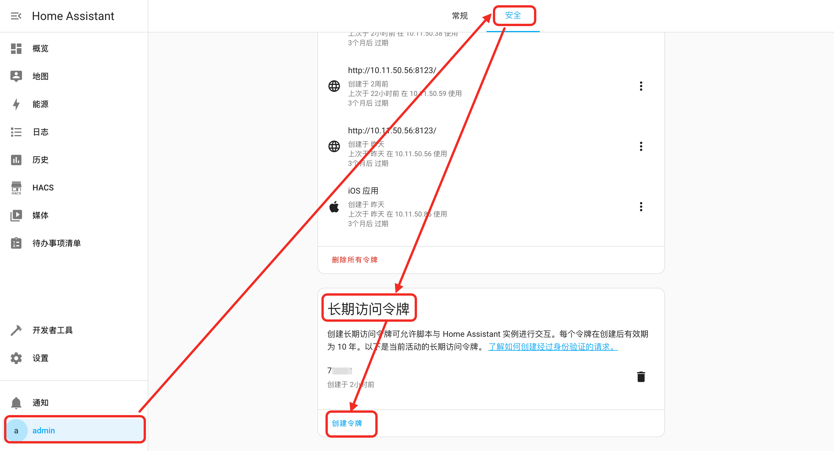 - 在 profile 页面,点击“安全”标签,找到“长期访问令牌”,单击“创造令牌”,即可生成 Home Assistant Token,用于在 Aqara Studio 上 添加 Home Assistant 生态设备。