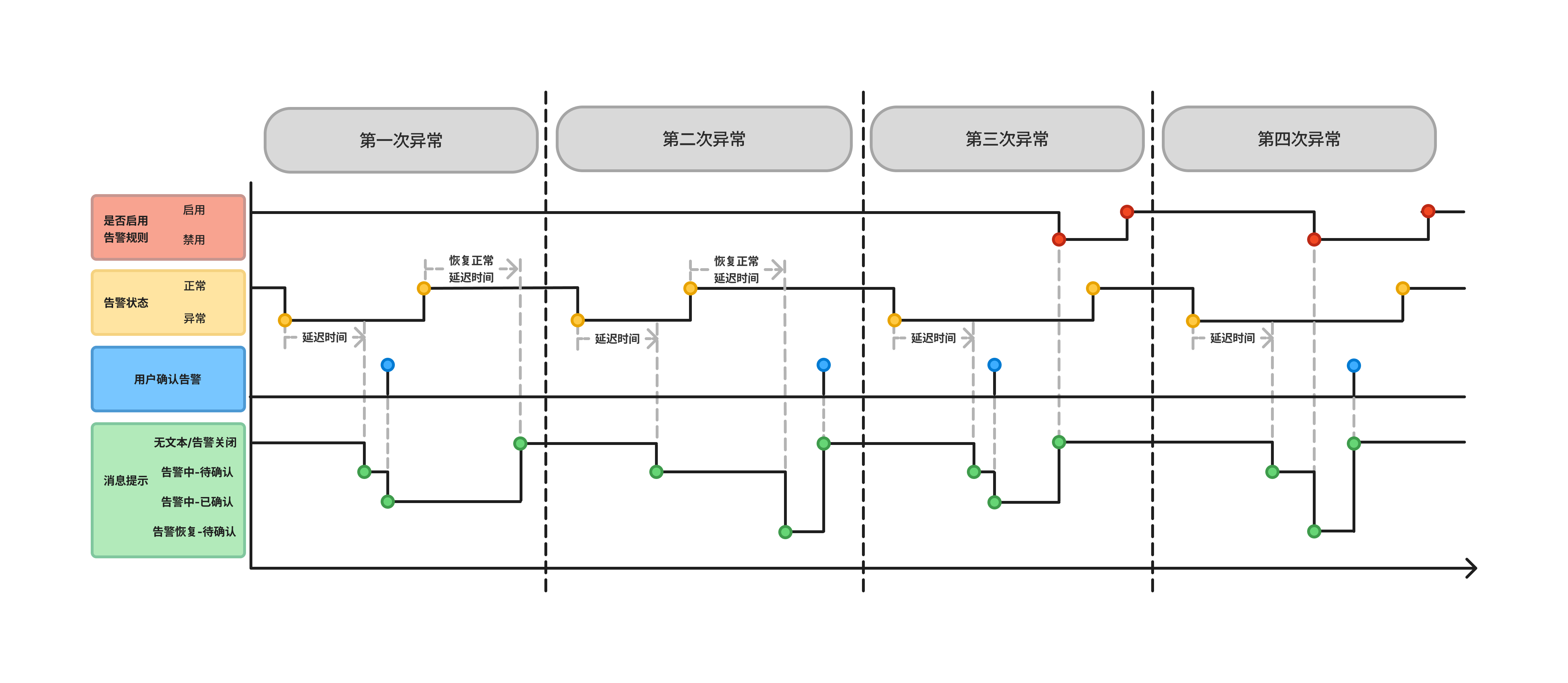 参数 说明 源名称 告警的自定义名称。 告警值 功能点达到该值时触发告警。当为布尔型功能点时,此参数为单选;当为枚举型功能点时,可多选。 告警类型 告警级别,可选 Normal、Urgent、Important ,也支持自定义类型。 延迟时间 指定功能点满足告警条件后,若在此时间段内始终未恢复正常,系统才会向用户发出告警。可用于避免因短暂波动导致的误报。 正常延迟时间 功能点脱离告警状态后,需在设定延迟时间内未再次发生异常,才会判定为已恢复正常并向用户提示,以避免异常短暂波动频繁提醒。 偏离正常文本 触发告警时显示给用户的提示内容。 恢复正常文本 恢复正常后显示给用户的提示内容。 下图直观展示了延迟时间、正常延迟时间、用户确认告警,以及告警规则启用后的整体时间轴: