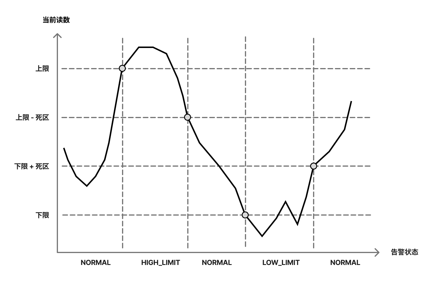 下图展示了设备读数分别突破下限、上限,以及回到下限+死区、上限-死区等关键点时,告警状态随数值变化的响应过程。