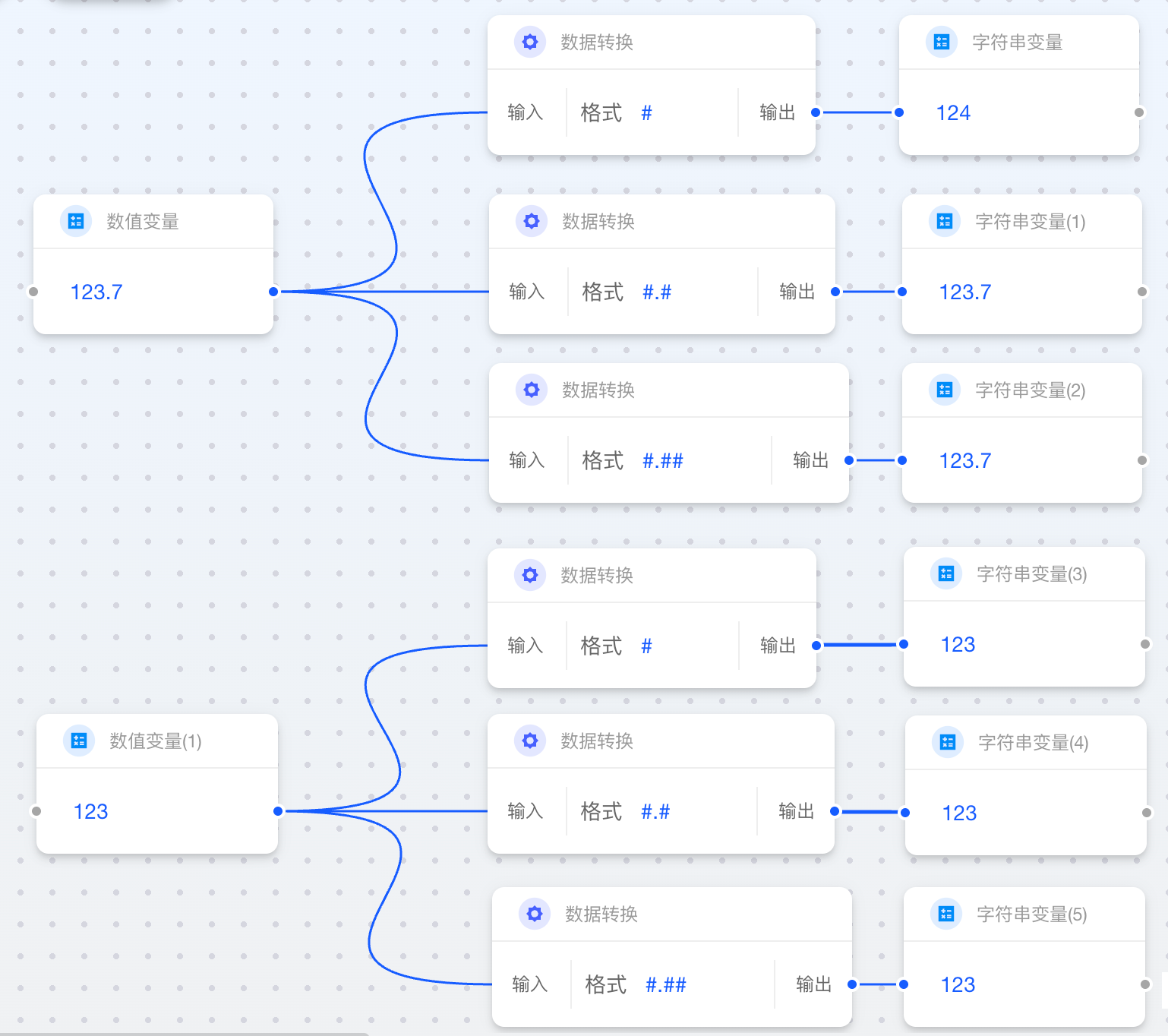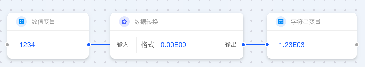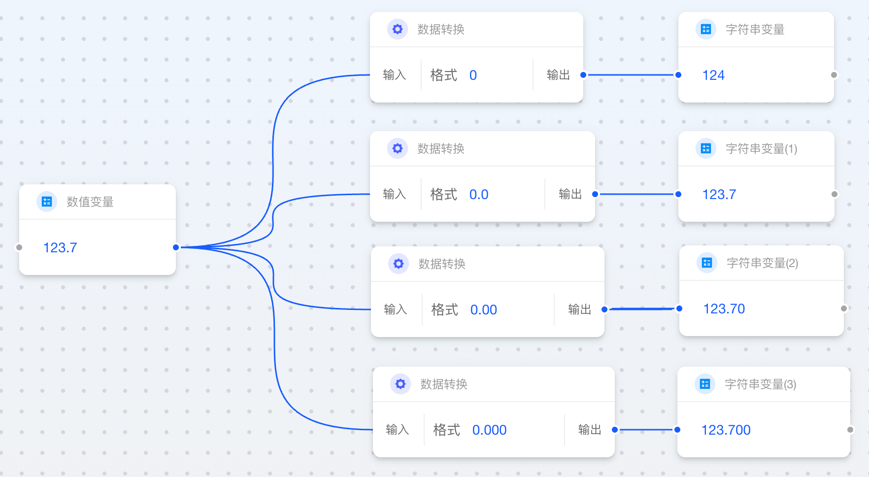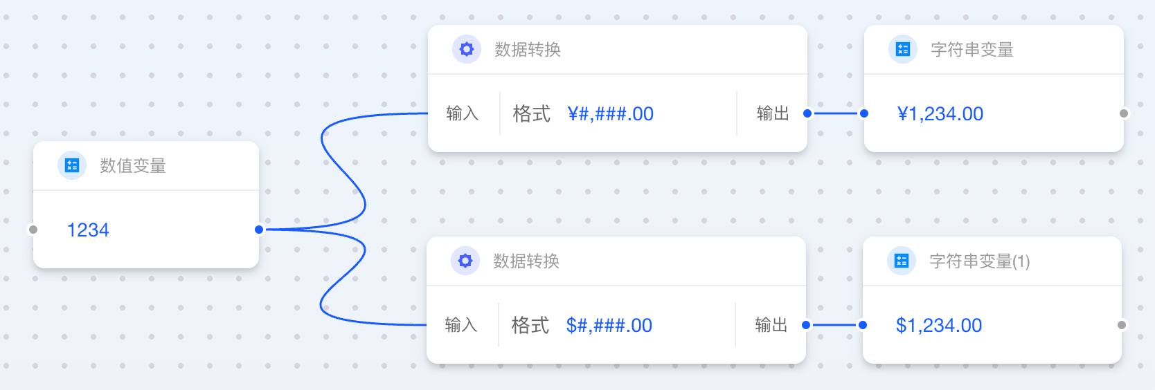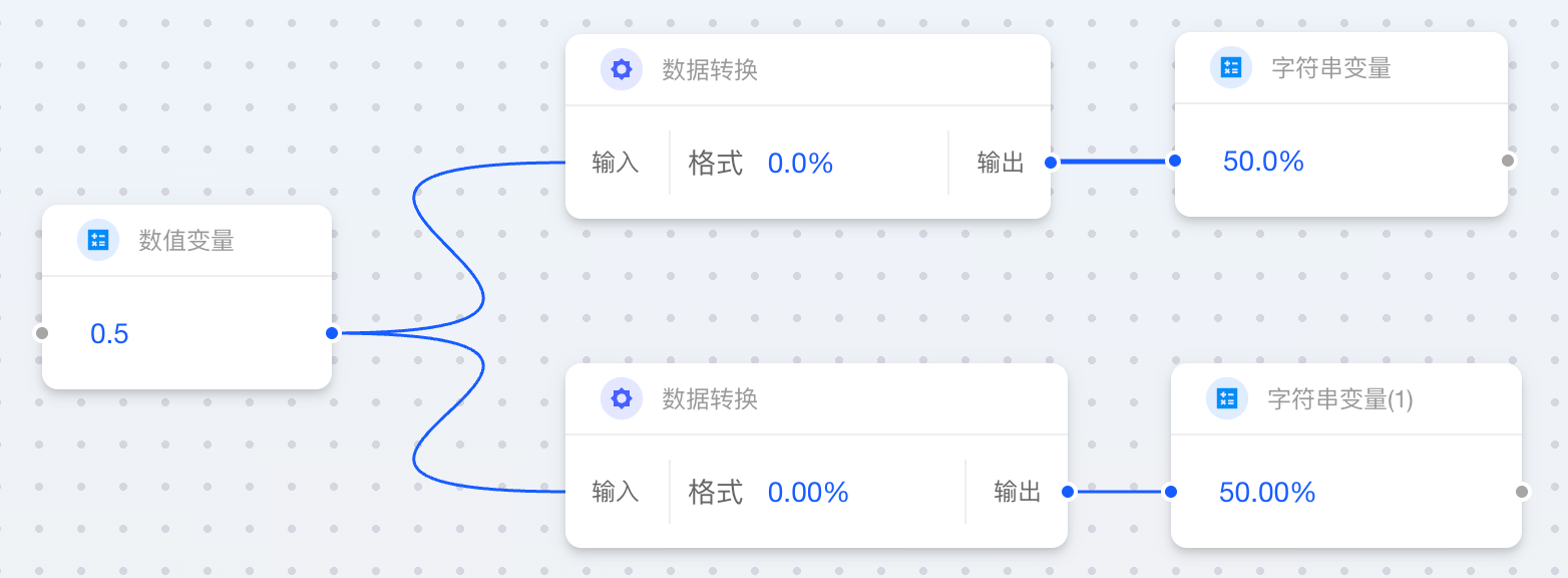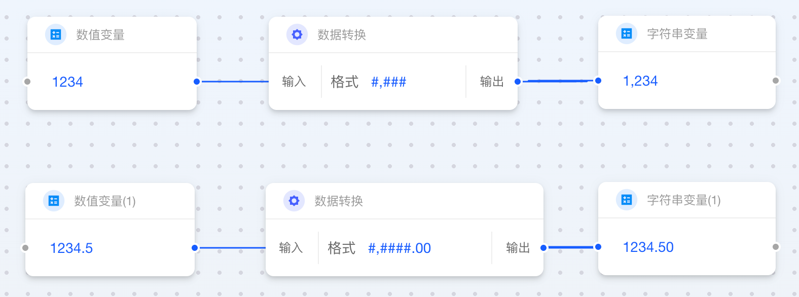 当数值类卡片连接至字符串类卡片时,您需要指定一个“格式”字符串。该格式决定了最终字符串是否包含小数位、千位分隔符或其他符号。