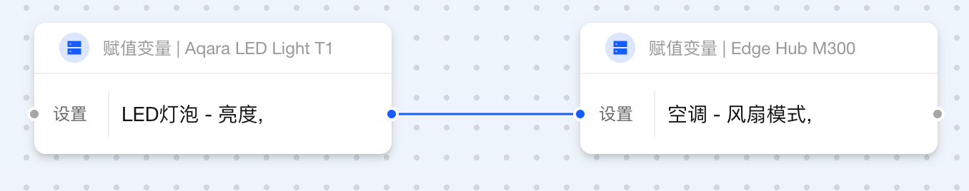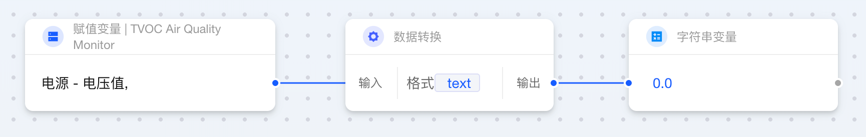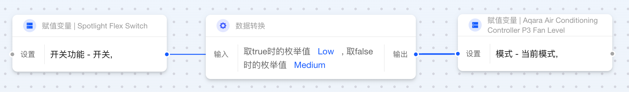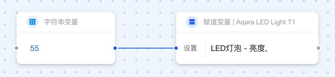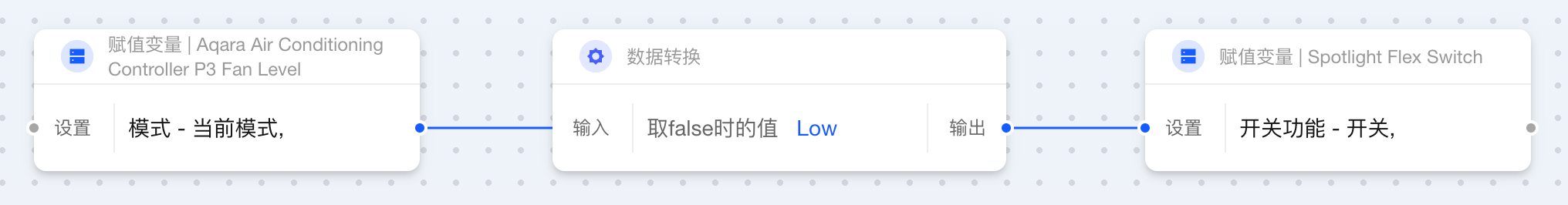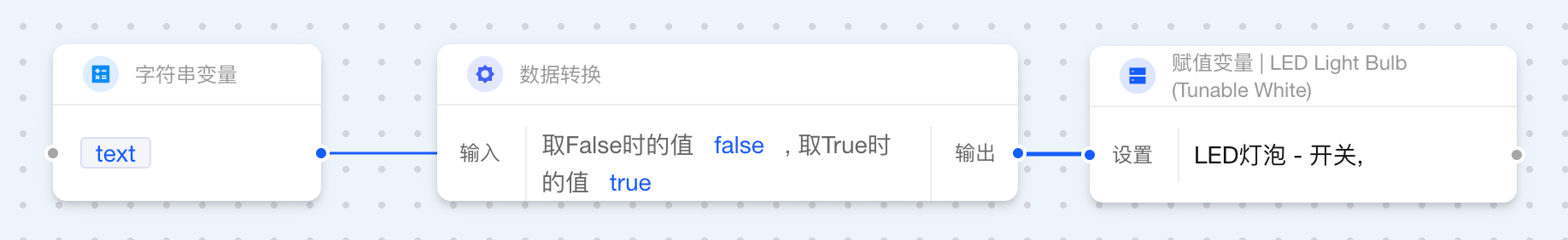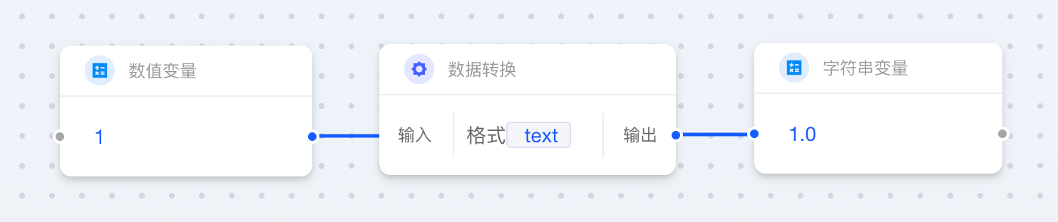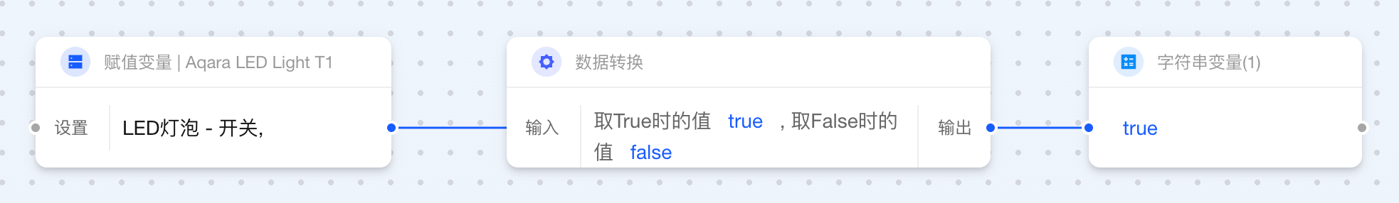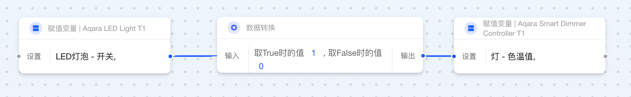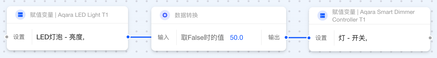 当两个卡片相连而输出与输入数据类型不一致时,Aqara Studio 会自动插入数据转换卡片。借助这一功能,您无需额外操作,就能在自动化流程中轻松定义数据的最终形态。例如,将数值 1 转换为文本 "1.0",或将布尔值 false 映射为更直观的状态“设备已离线”。