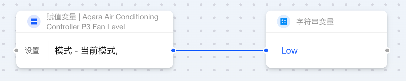 当枚举类卡片连接至字符串类卡片时,字符串类卡片会直接获取输入枚举值的名称,如图所示,字符串变量直接展示了设备的当前模式,即 Low。