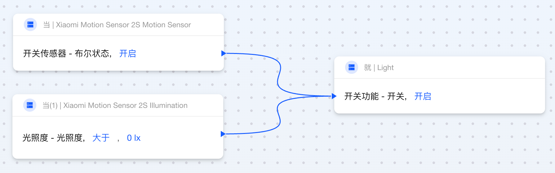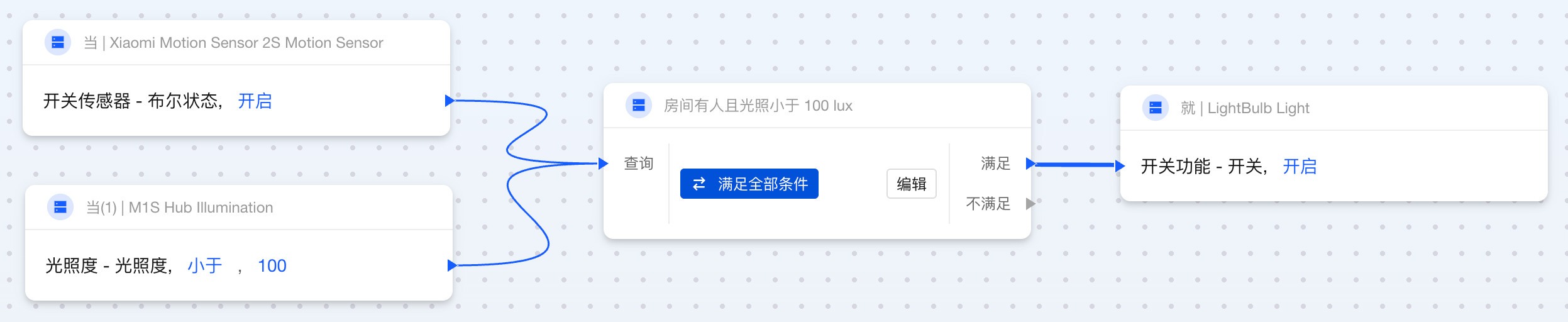 当卡片连接到且卡片的输入点,即只要监测到房间有人或光照不足时,就会触发查询。 - 点击 就 按钮,选择灯,添加