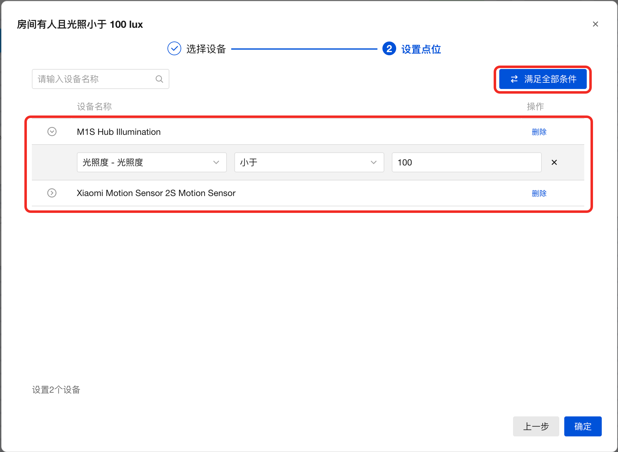 当按钮,选择光照传感器,添加光照度卡片,并将条件设置为光照度 小于 100 lux,用于检测房间是否昏暗。 - 批量选择 且 卡片,选择上述人体传感器和光照传感器,分别添加查询条件“存在状态为开启”和“光照读小于 100 lux”,并设置“满足全部条件”。确保只有在“有人”且“光照不足”时才会触发后续动作。