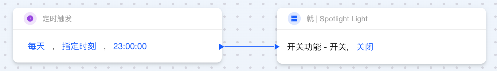 指定时刻,指定时间为23:00:00。 - 点击 就 按钮,在设备列表中选择 1 个灯泡,在功能卡片列表中选择