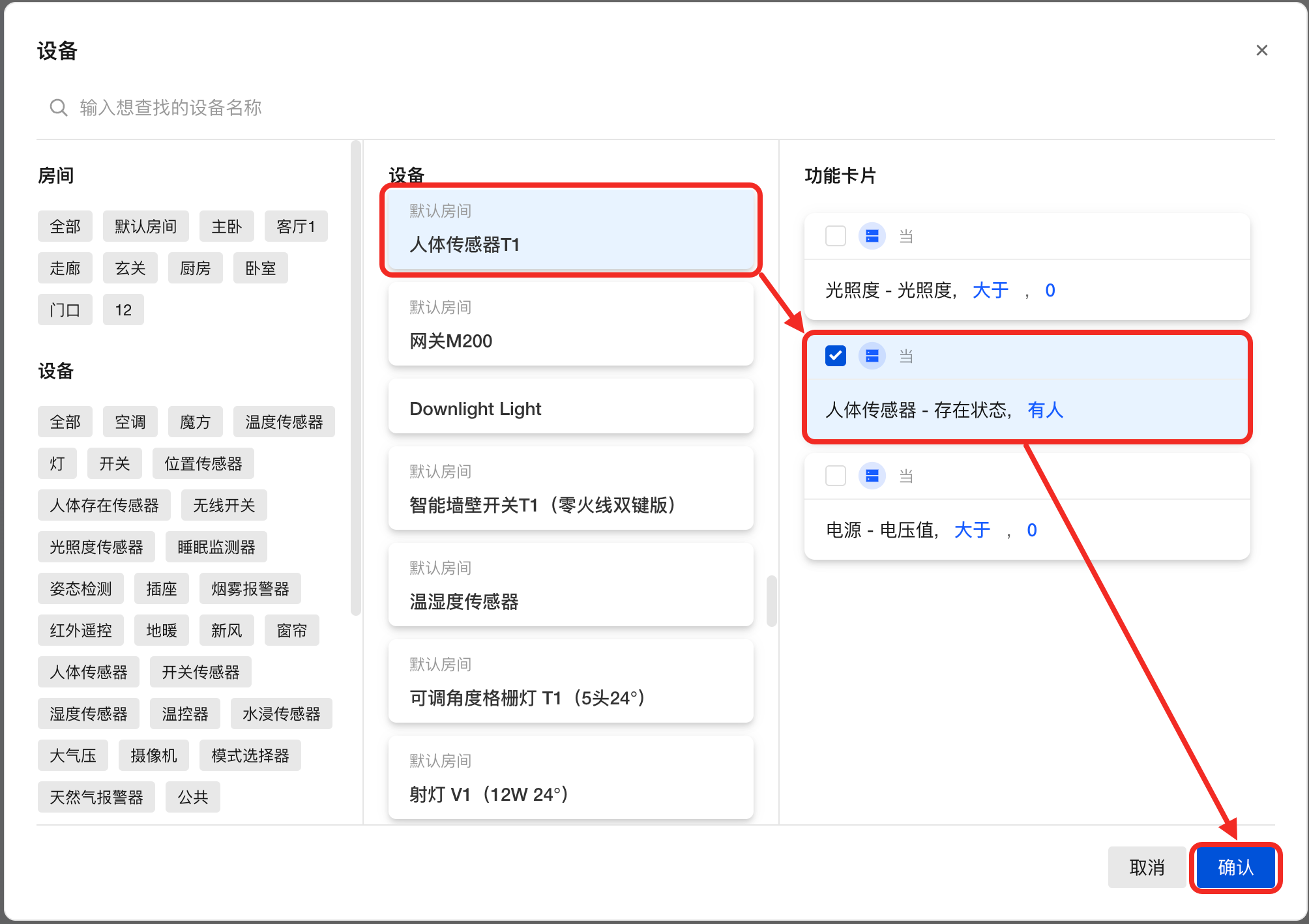 选择所需的设备及其对应的功能卡片,然后点击确认。