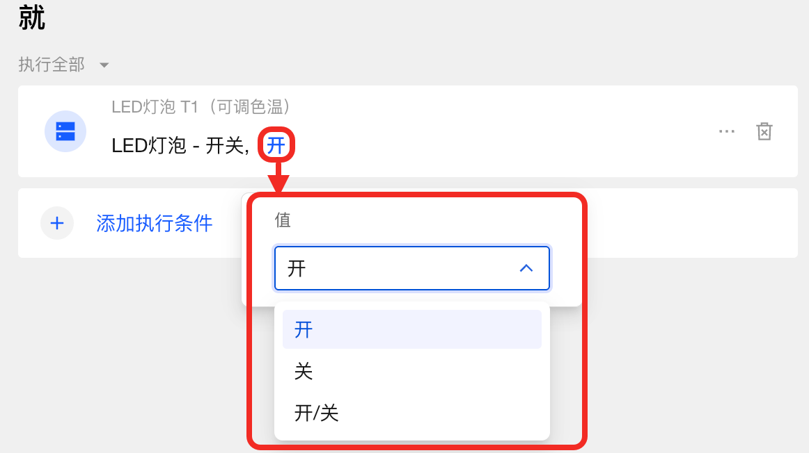 执行条件是指自动化触发后,需执行的设备动作或在动作间设置的延时步骤。
