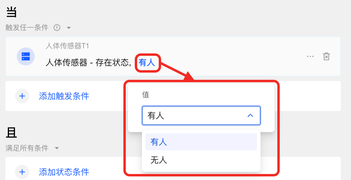 举例:你可以将“检测到房间有人”设置为当条件,同时在且中添加“空调为开启状态”。只有当房间有人且空调也处于开启时,才会执行后续动作。