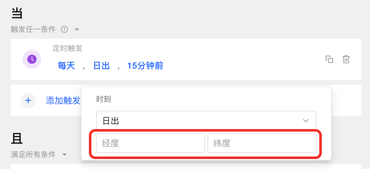 提示选择日出或日落时,请输入您家庭的经纬度,格式如下: