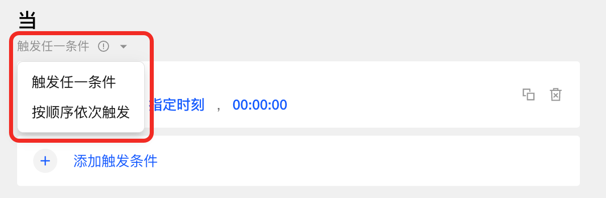 当您添加多个触发条件时,可以灵活设置这些条件的满足逻辑: