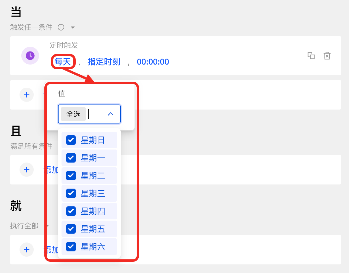 选择触发行为的日子(每周周几,可多选)。